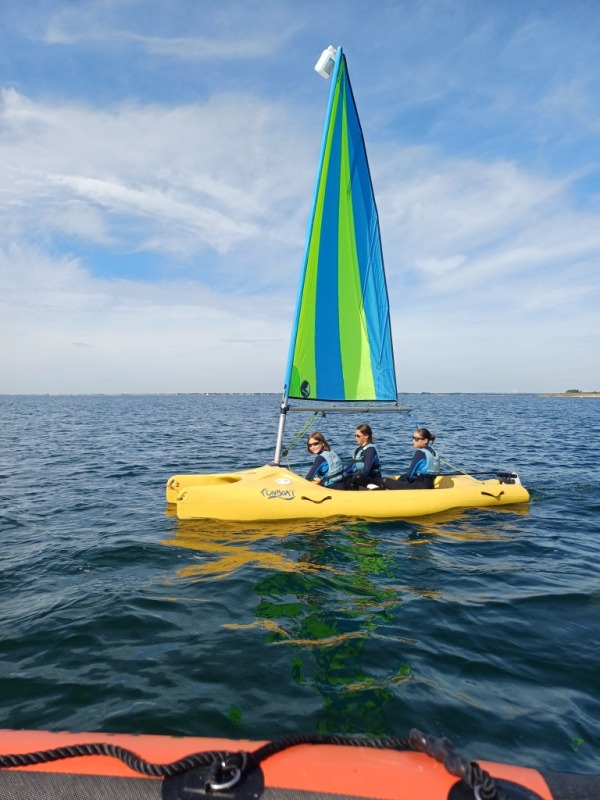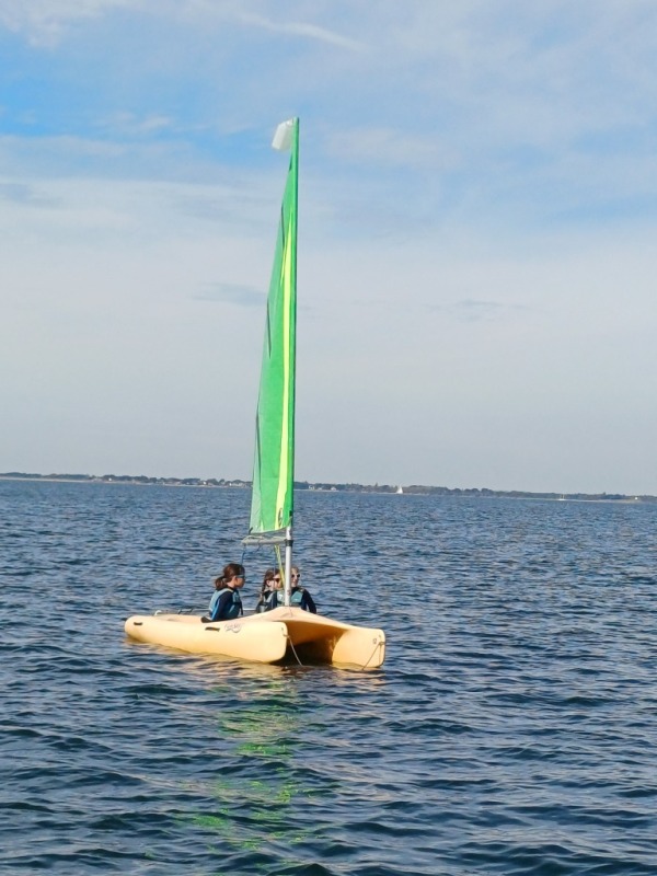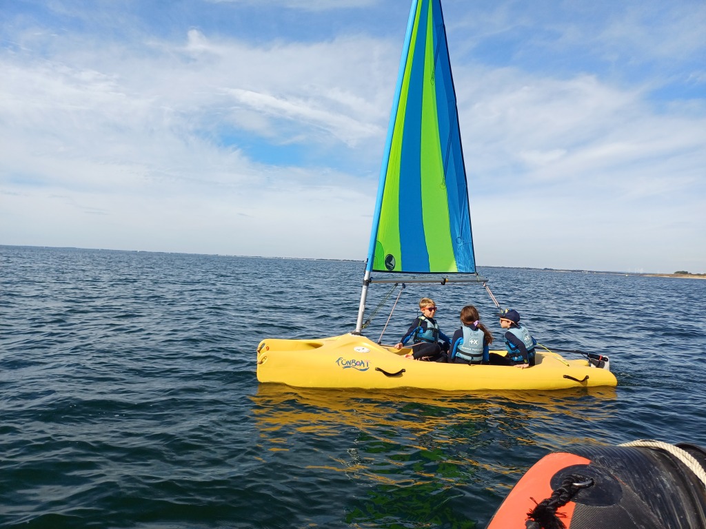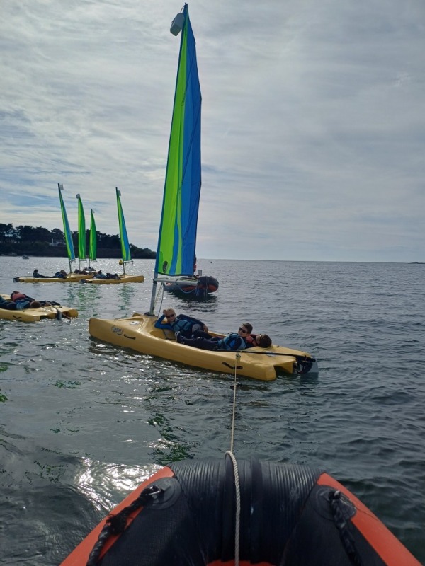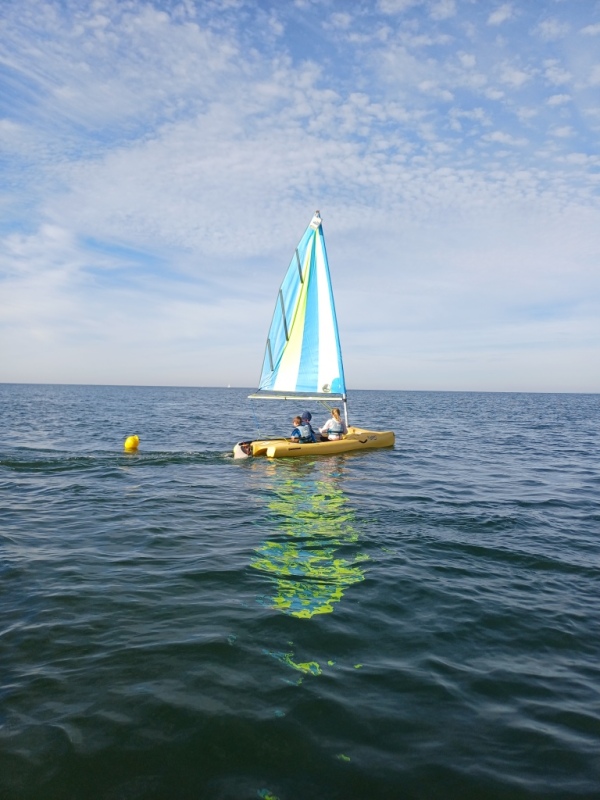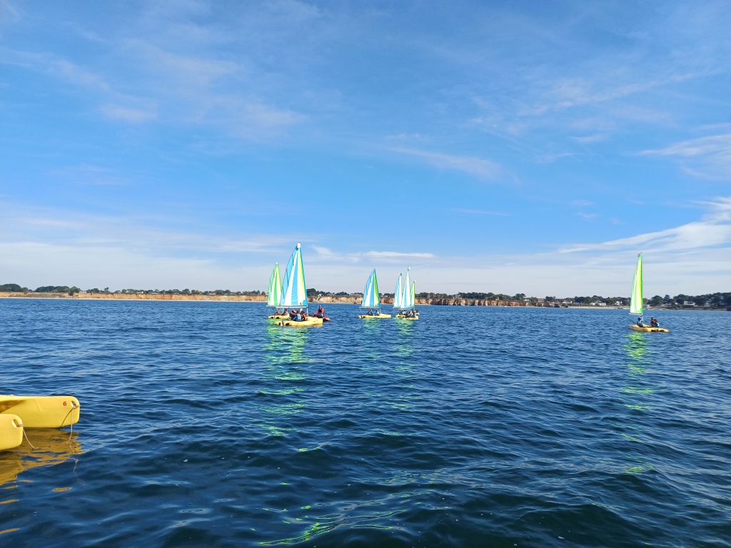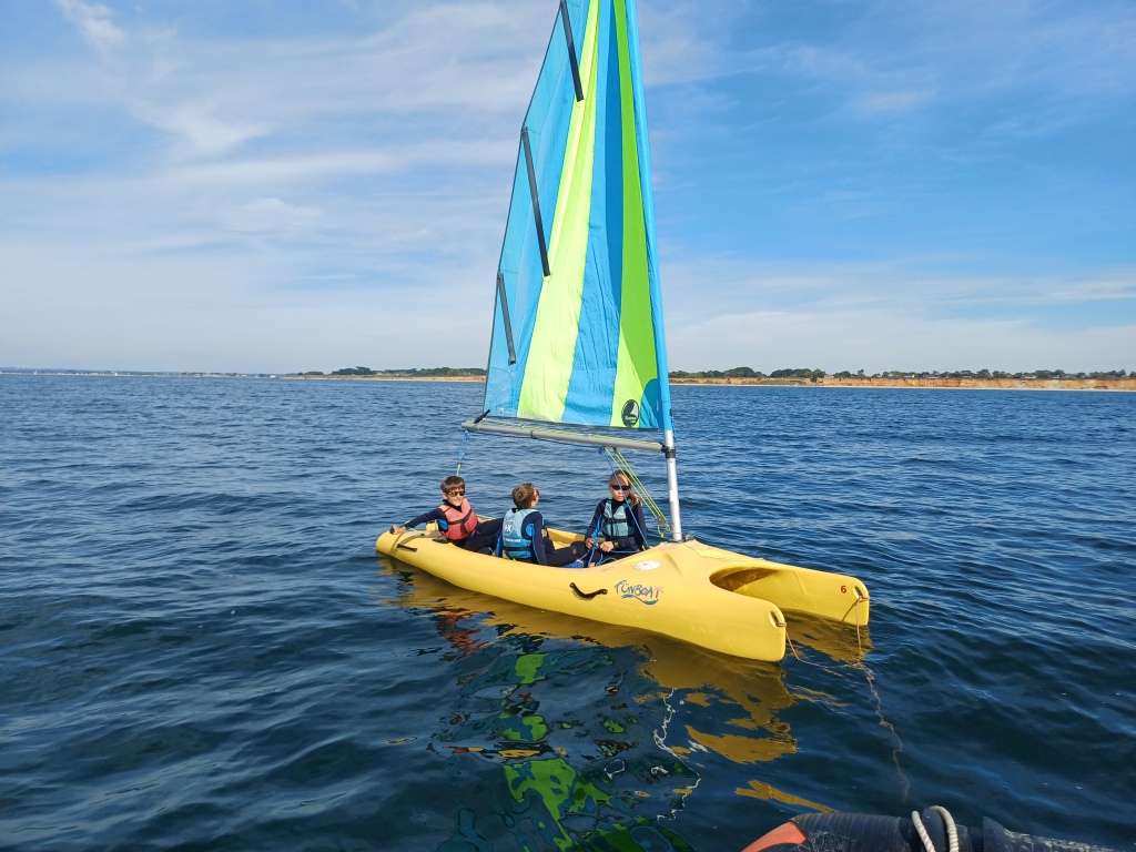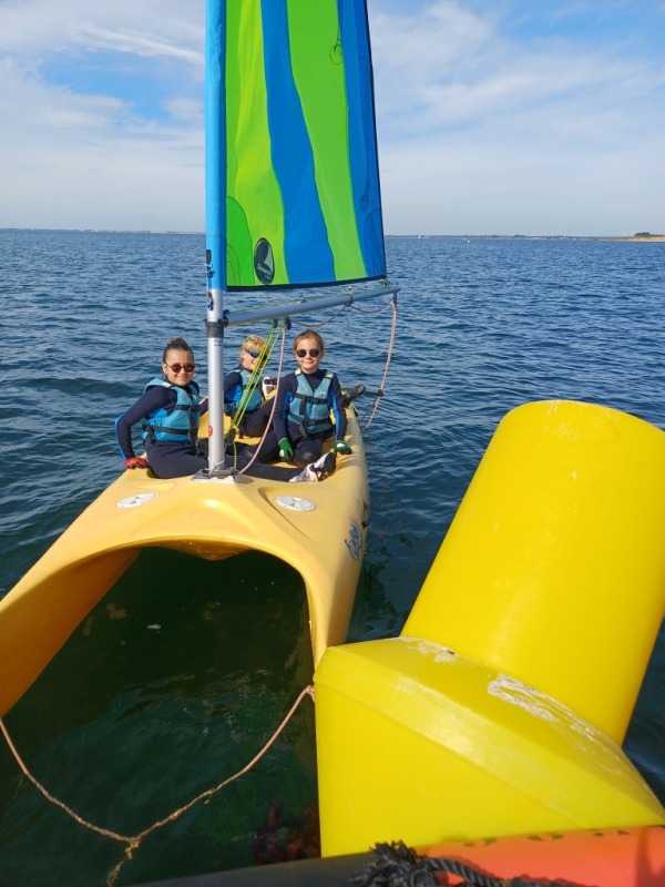 Puis départ à la voile, parcours entre 2 bouées, suivi d’un cap donné, virement de bord et même empannage, de nombreux apprentissages.