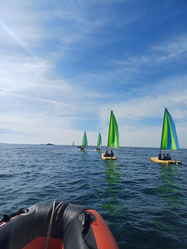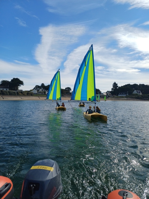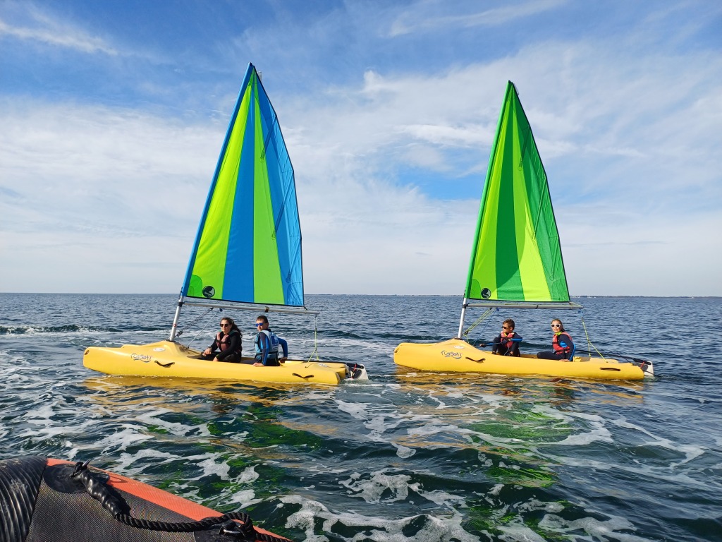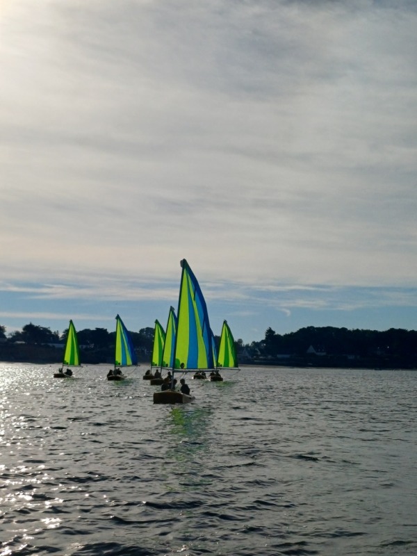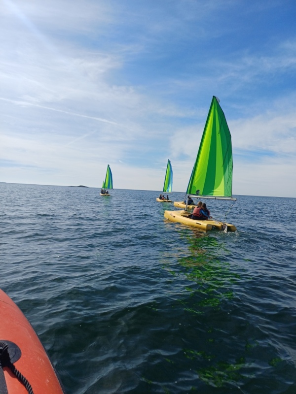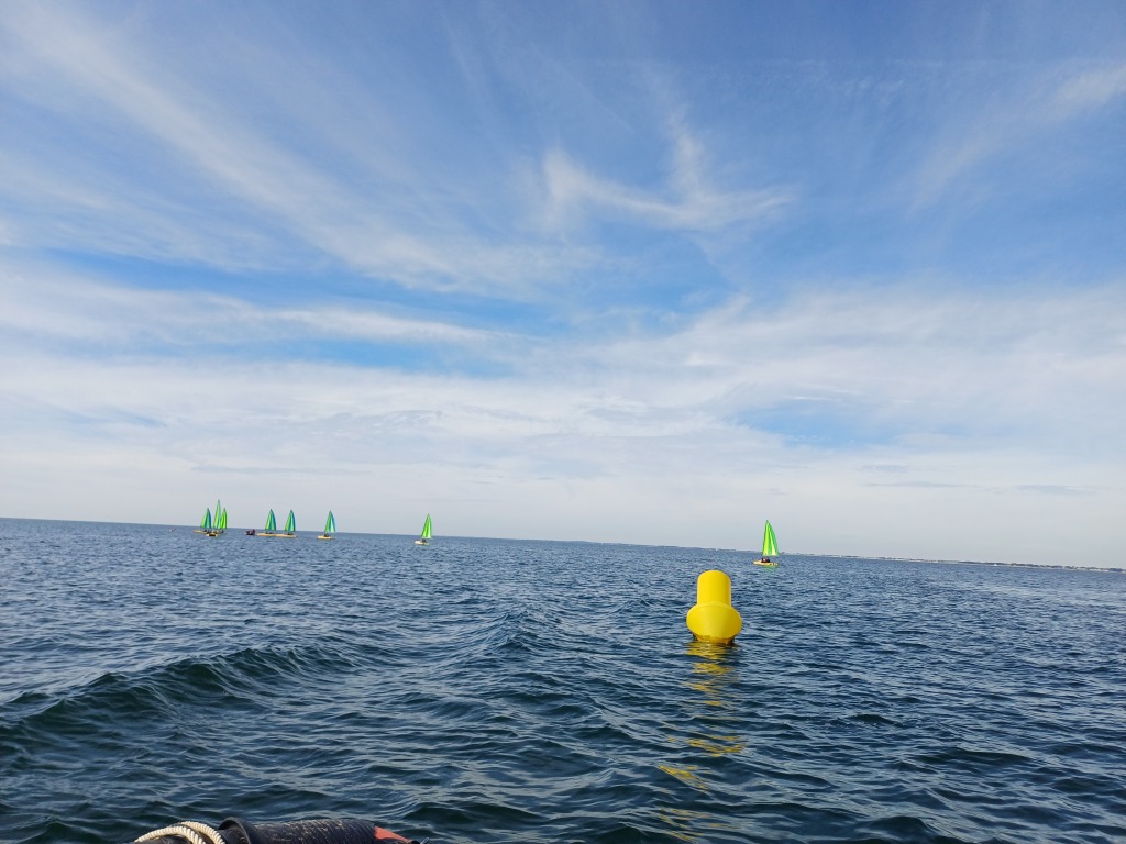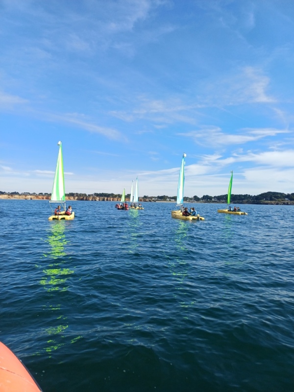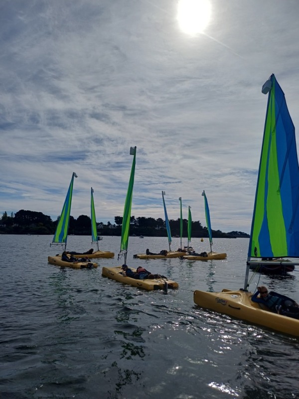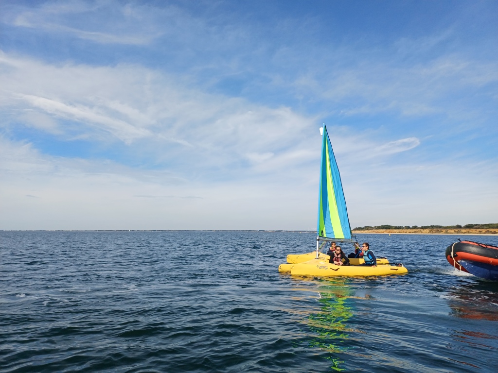 Puis départ à la voile, parcours entre 2 bouées, suivi d’un cap donné, virement de bord et même empannage, de nombreux apprentissages.