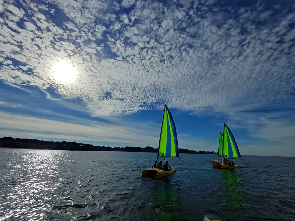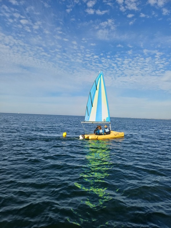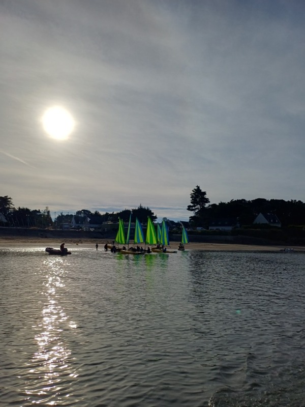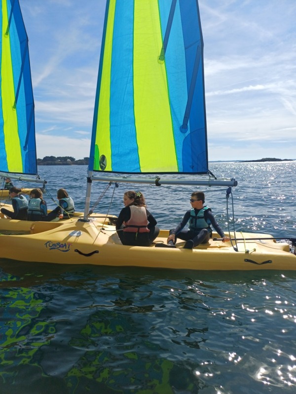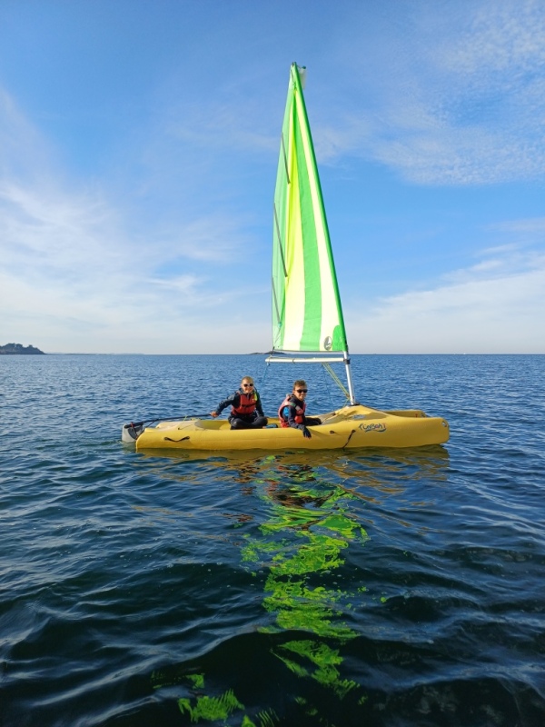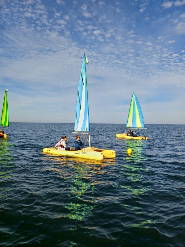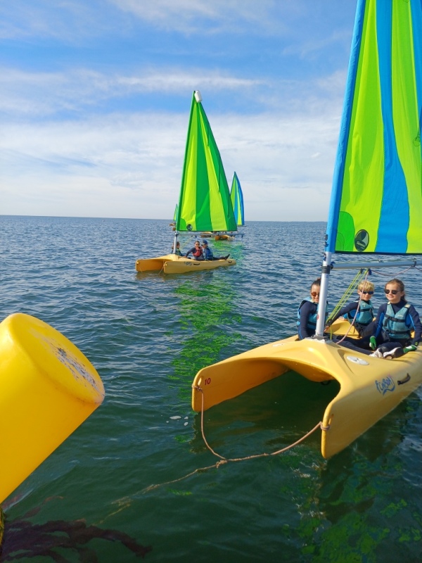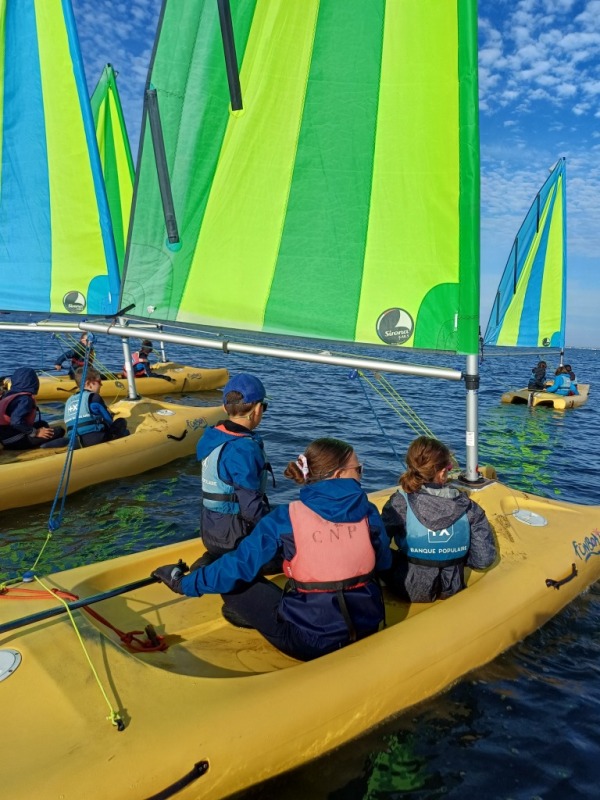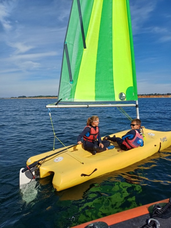 Puis départ à la voile, parcours entre 2 bouées, suivi d’un cap donné, virement de bord et même empannage, de nombreux apprentissages.