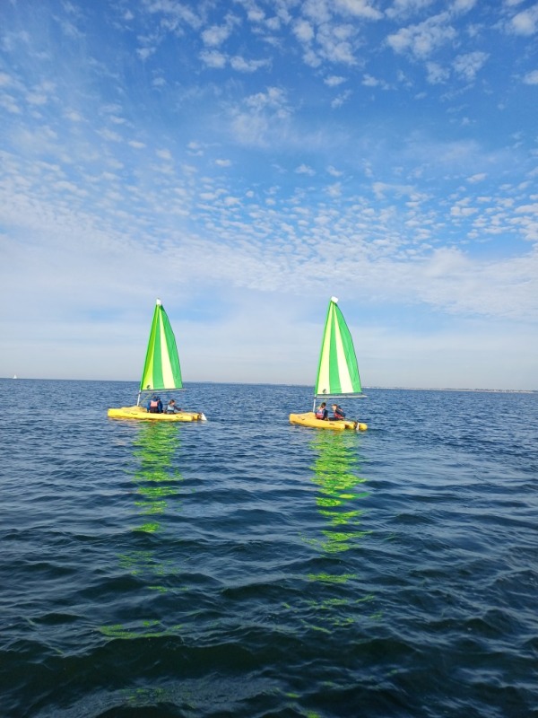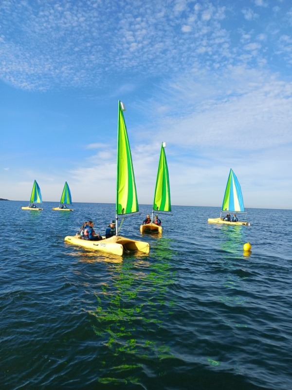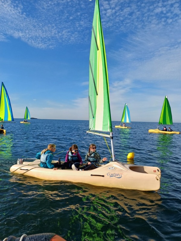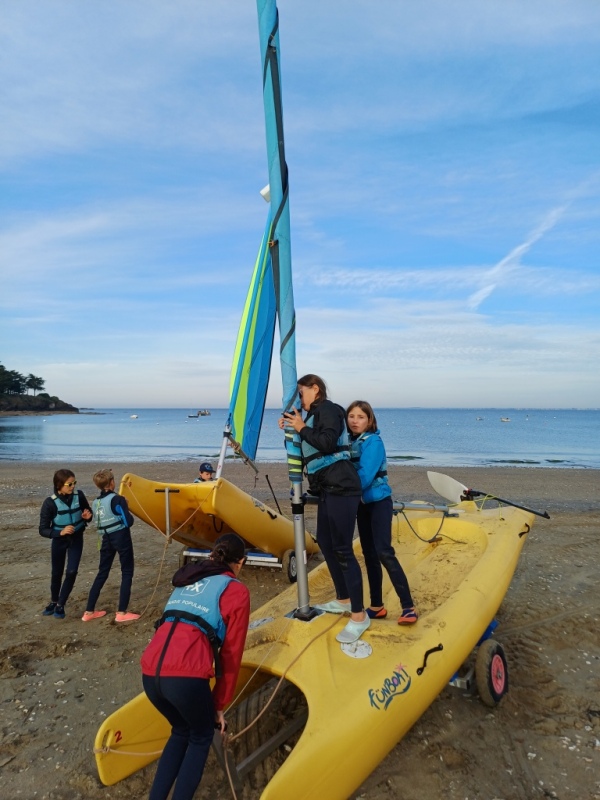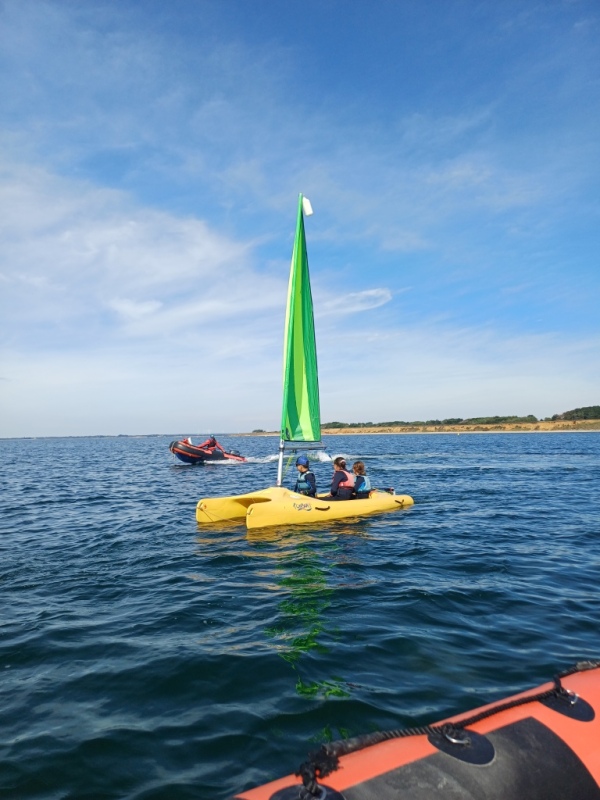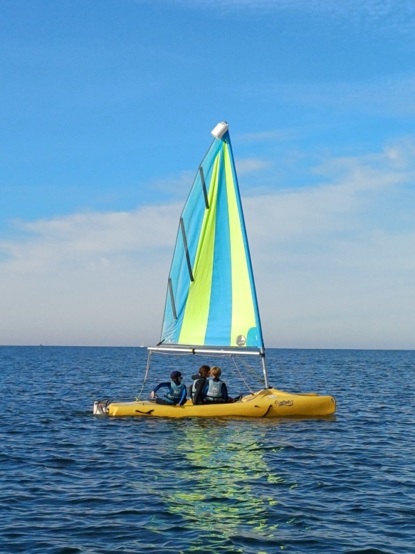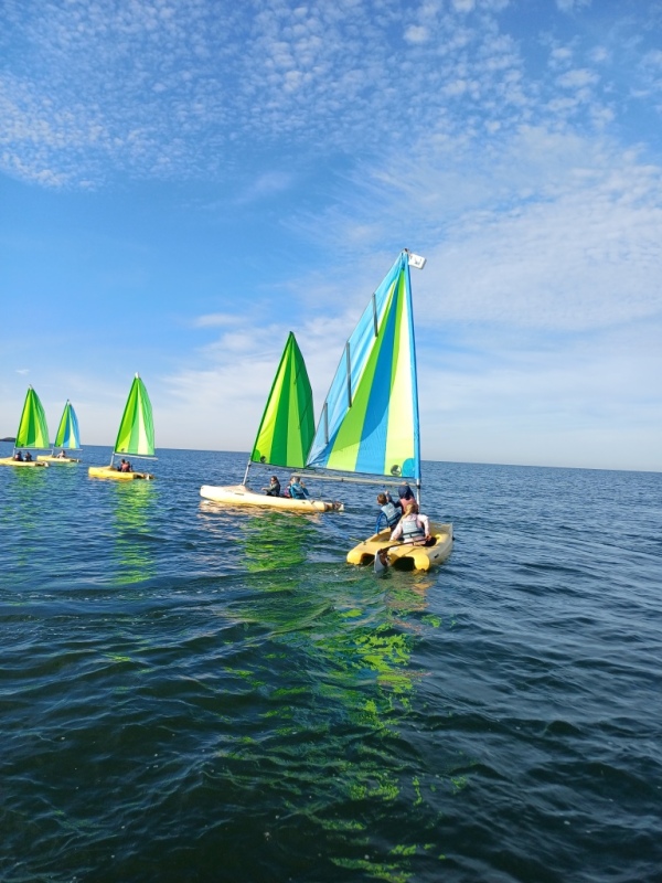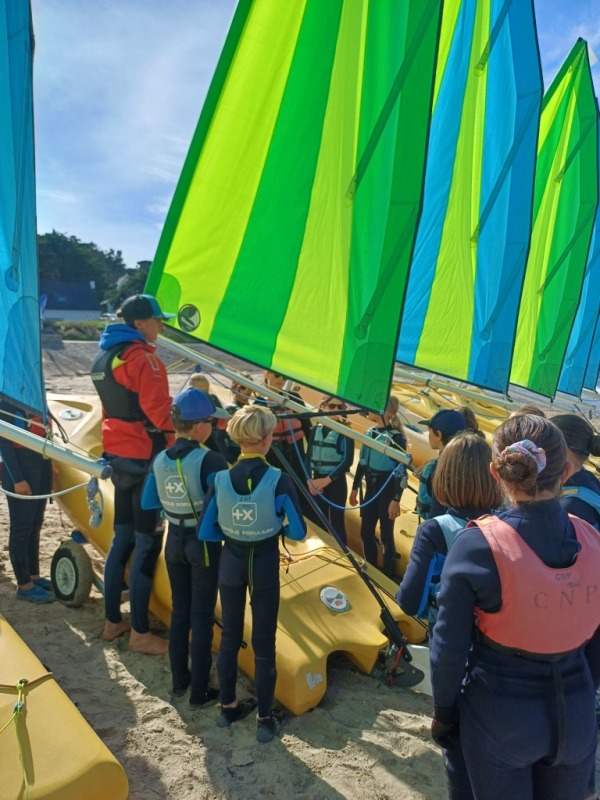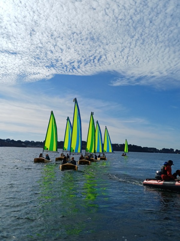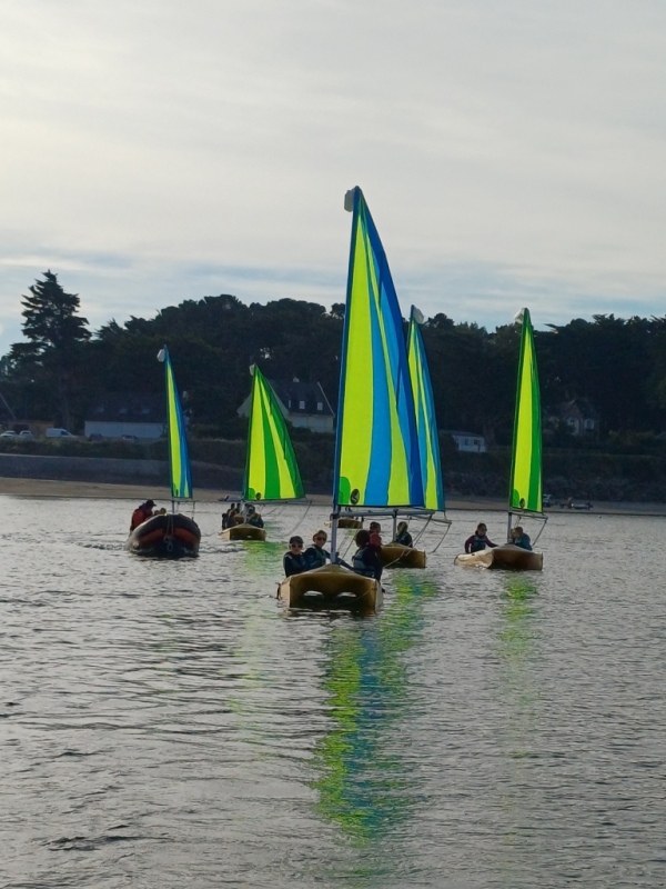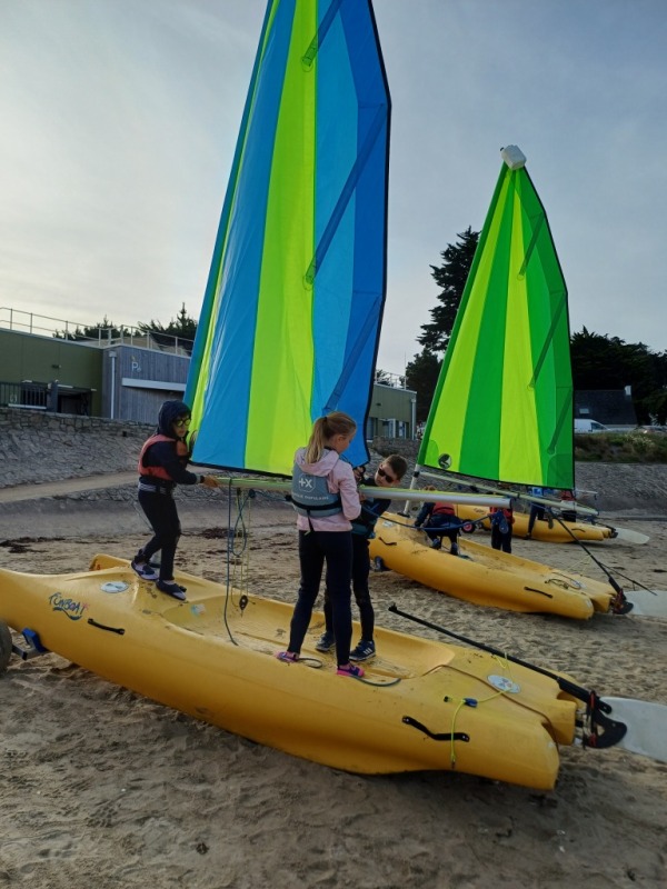 Puis départ à la voile, parcours entre 2 bouées, suivi d’un cap donné, virement de bord et même empannage, de nombreux apprentissages.