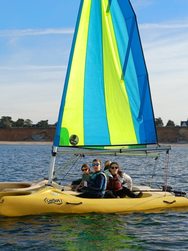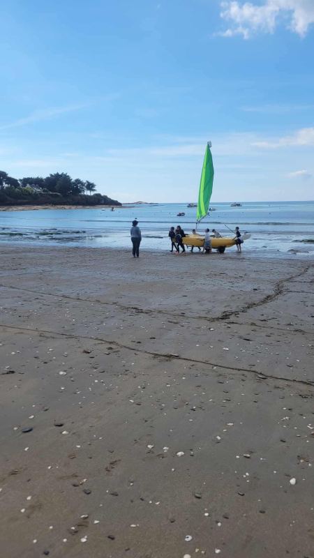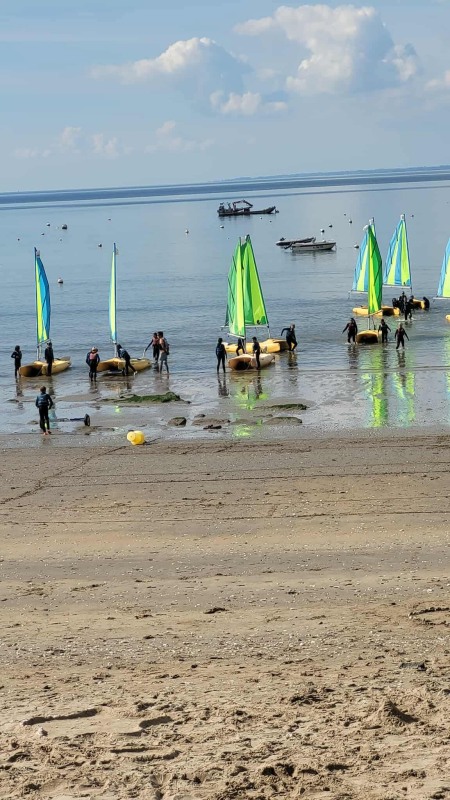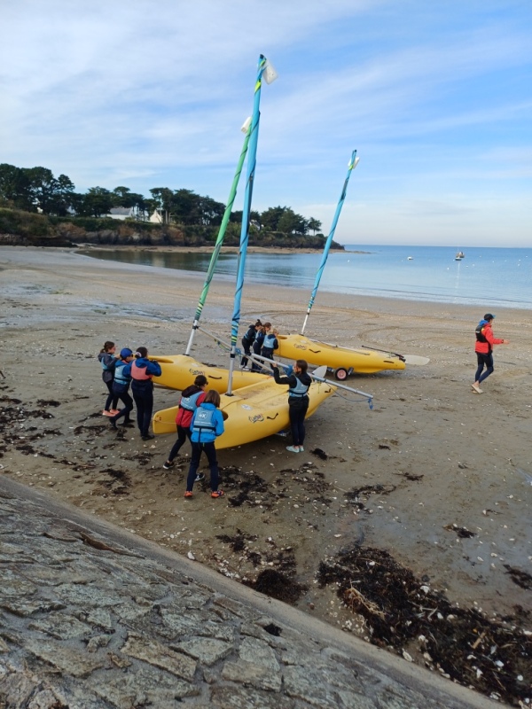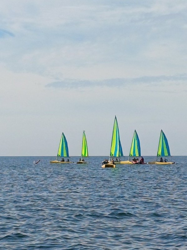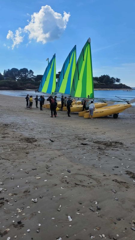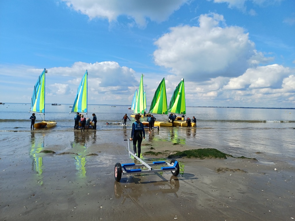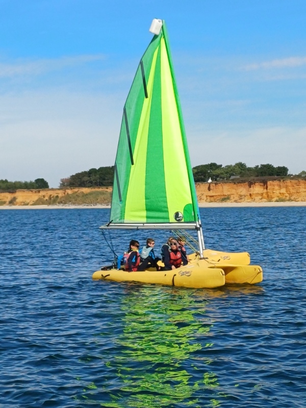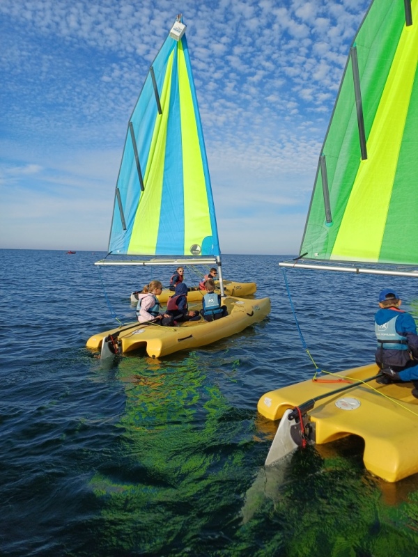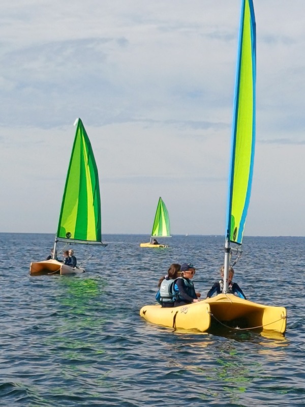 Puis départ à la voile, parcours entre 2 bouées, suivi d’un cap donné, virement de bord et même empannage, de nombreux apprentissages.