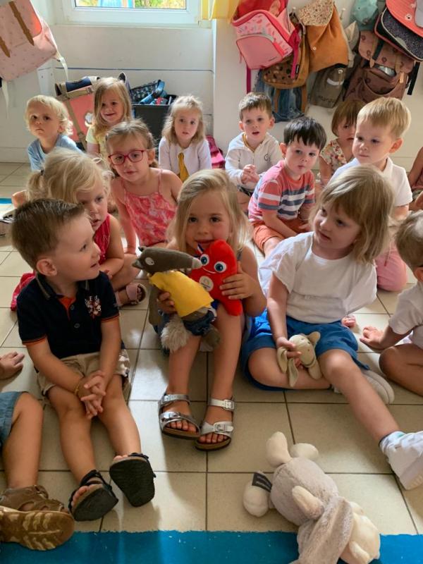 Les élèves avaient déjà remarqué que ces petits personnages étaient présents dans l’école, dans les cahiers, les affichages, les feuilles, sur les porte-manteaux…. Maintenant elles sont également présentes en peluche!