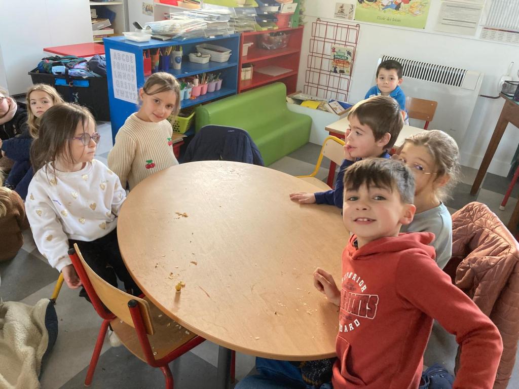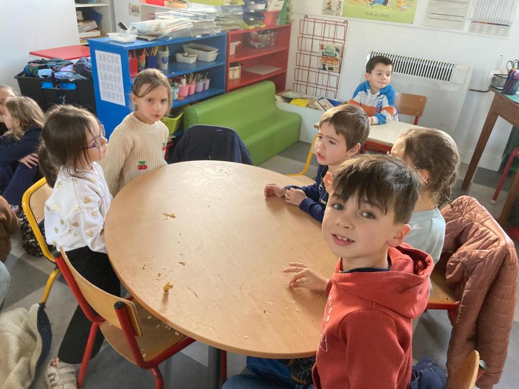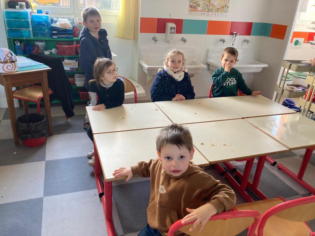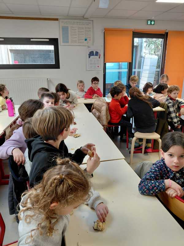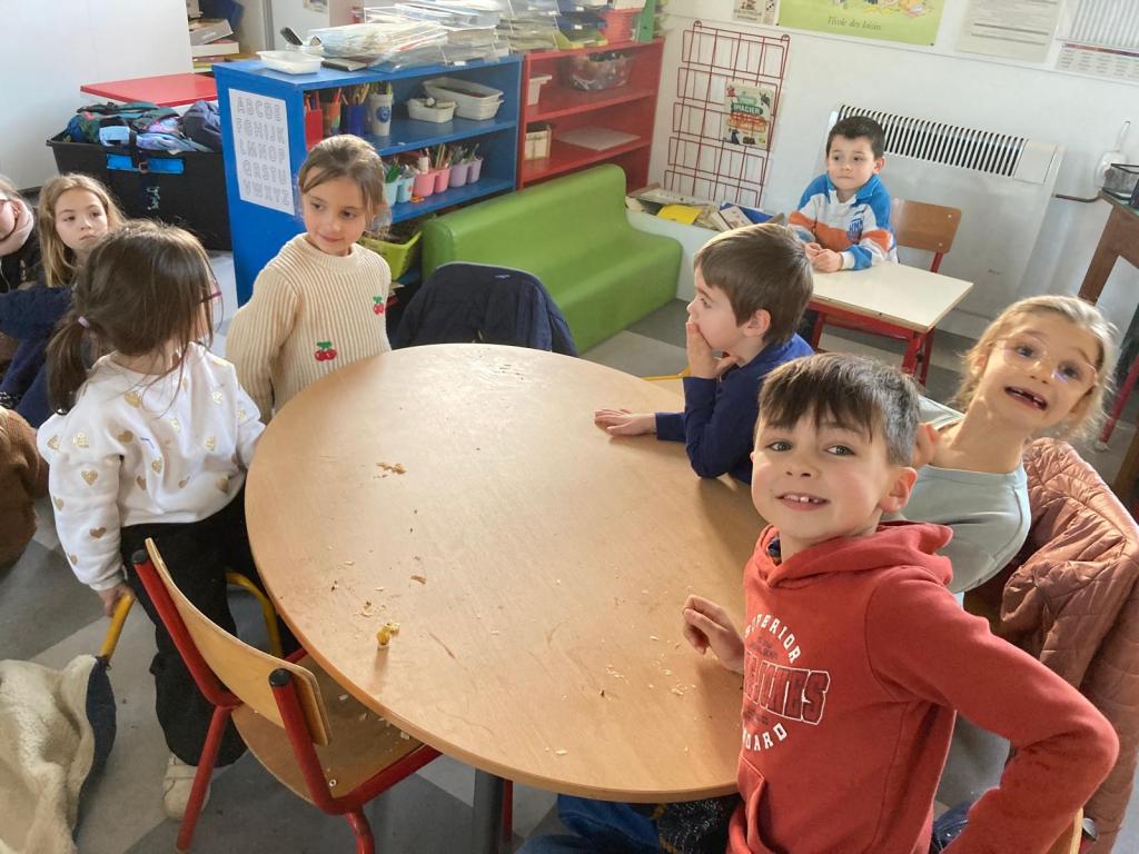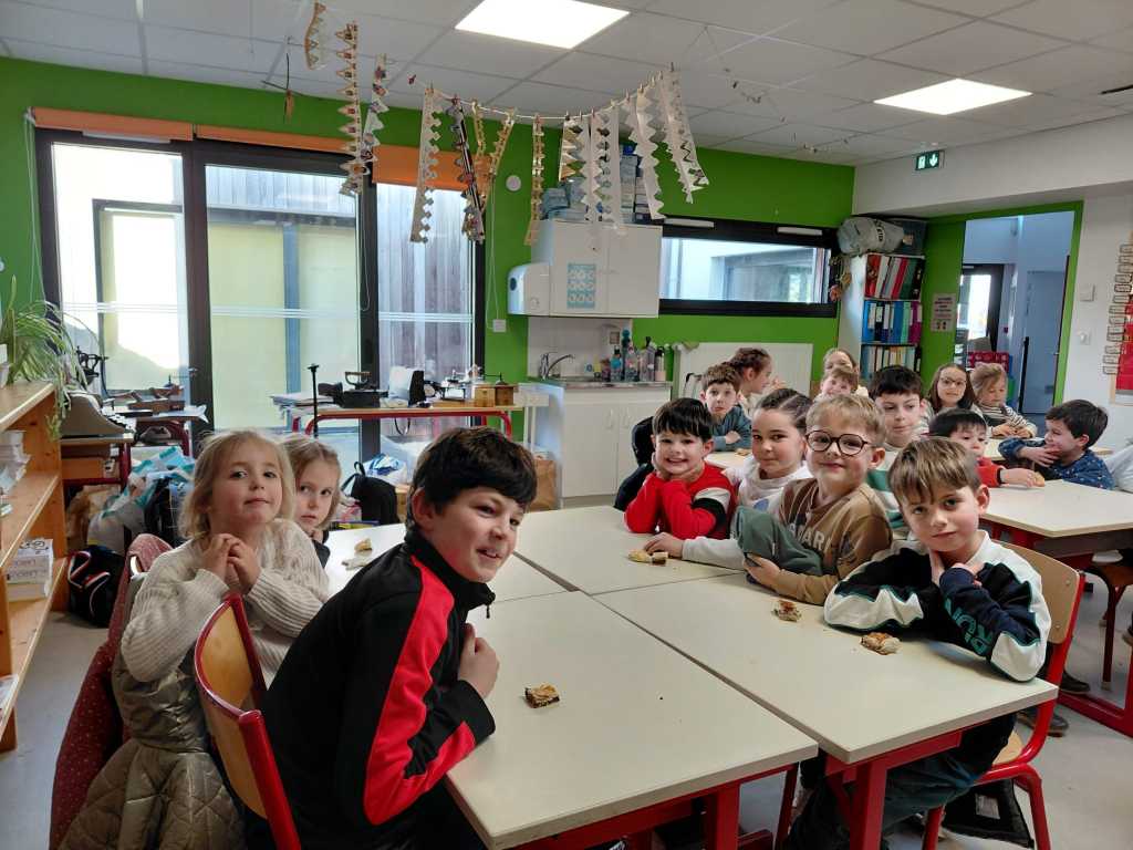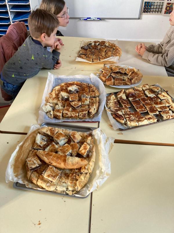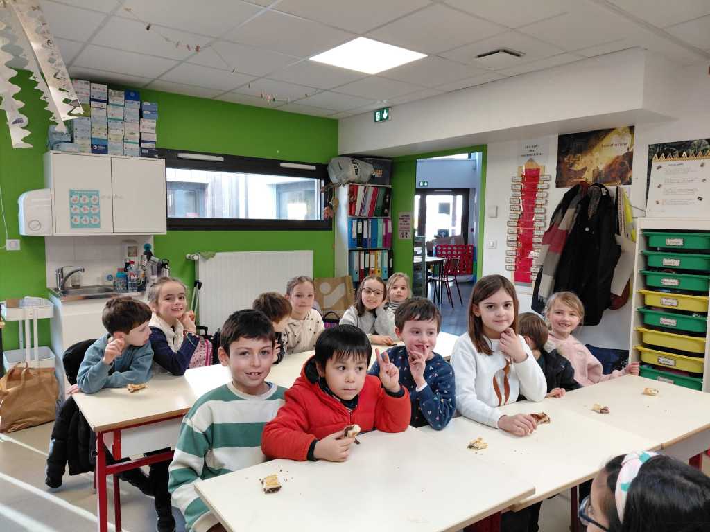 Mardi 27 janvier, pour terminer la journée tous les élèves se sont retrouvés entre parrains/marraines et filleuls pour déguster les galettes frangipane-chocolat que les ps et les ms avaient cuisinées la veille avec les parents et grands-parents. Tout le monde s’est régalé, bravo aux cuisiniers.